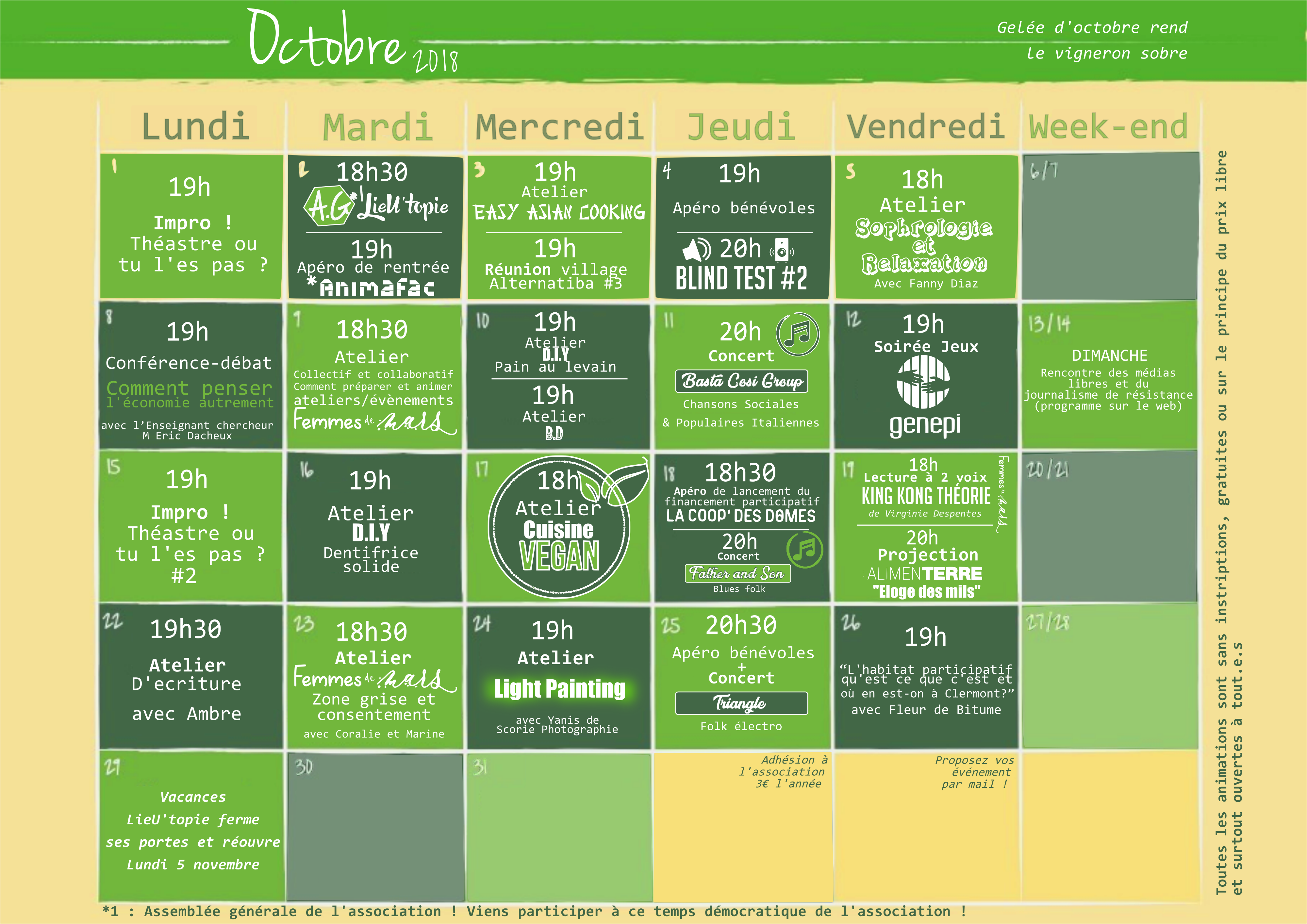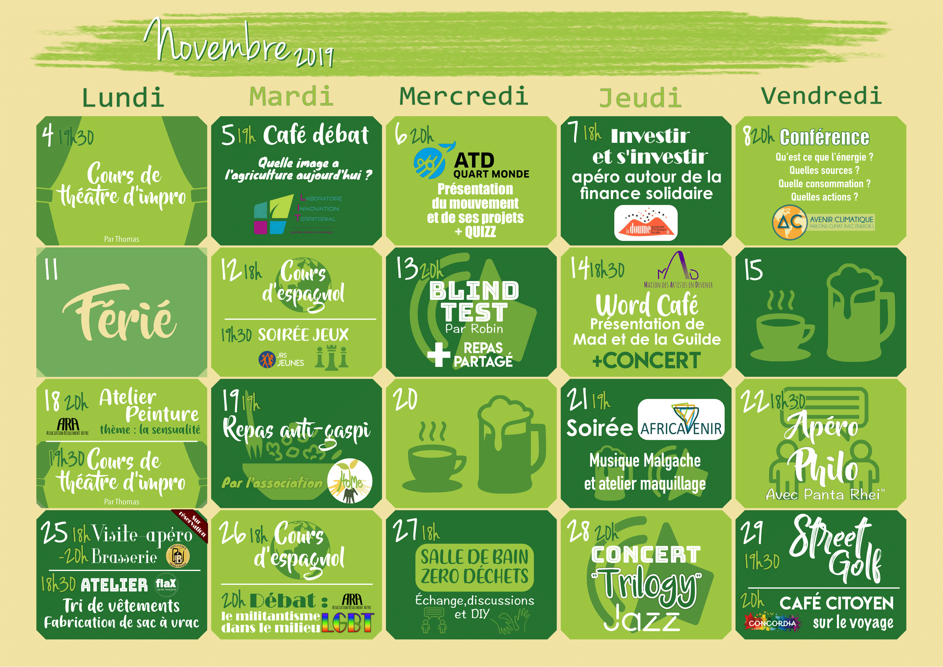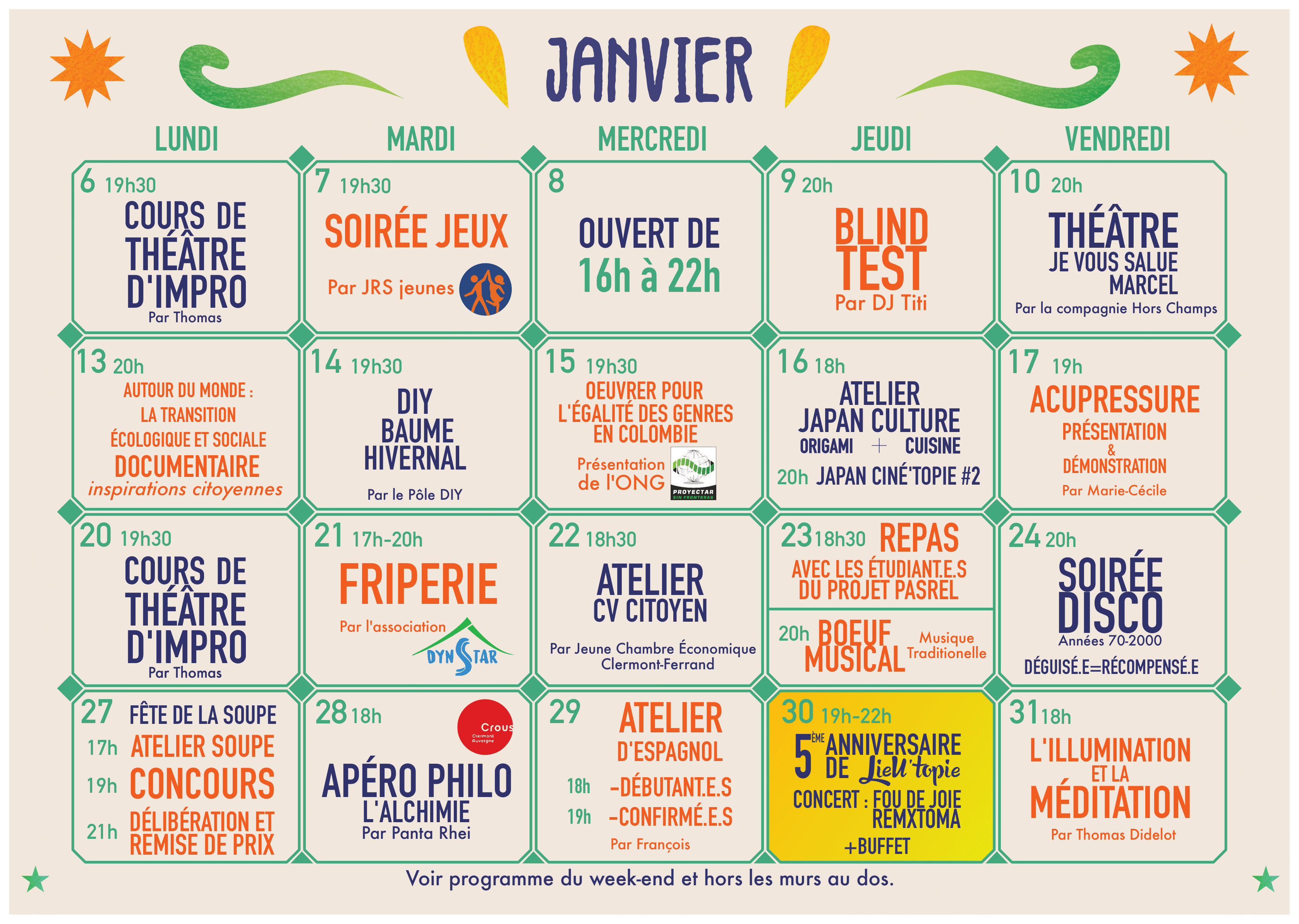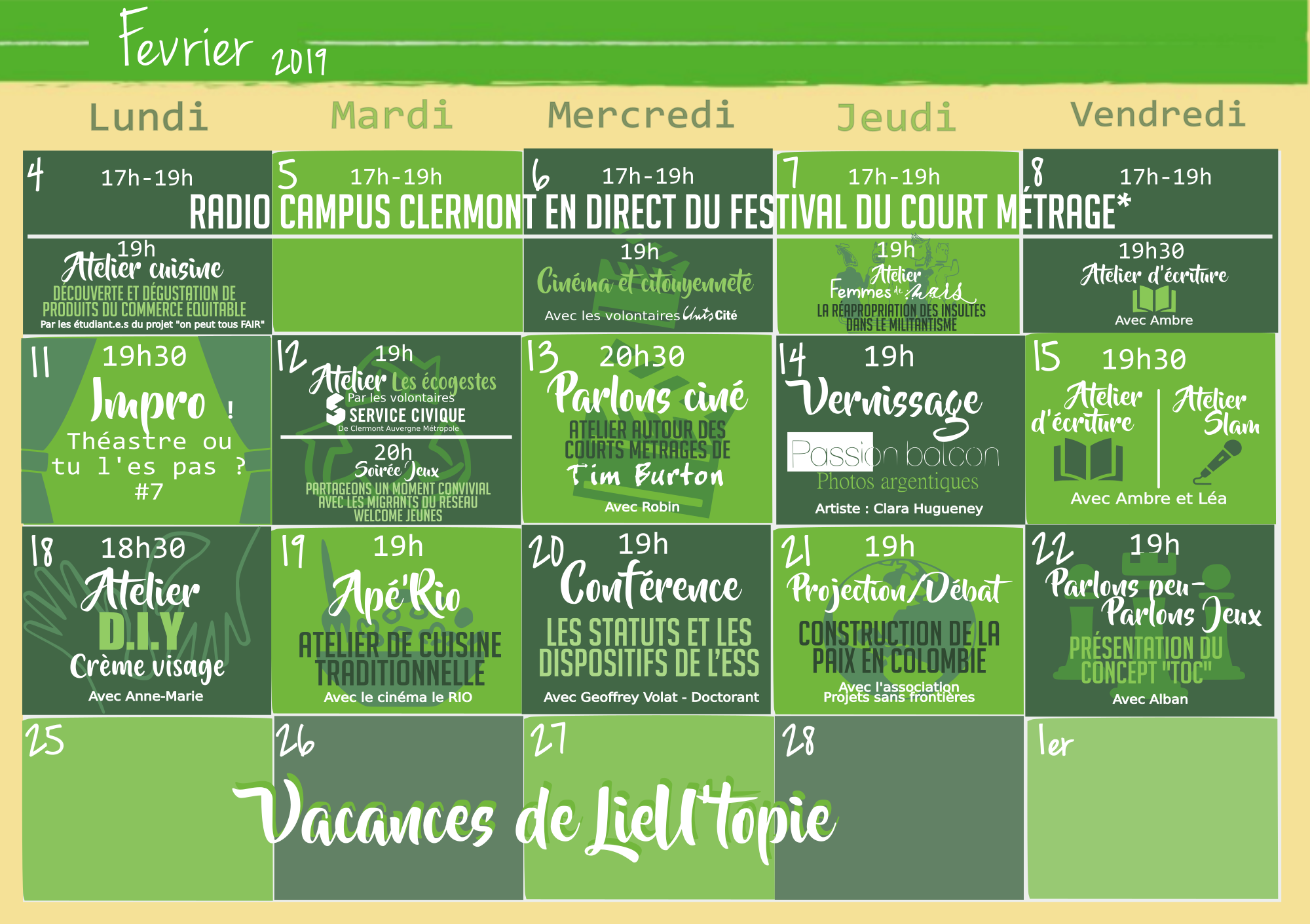 Ses actions, s’inscrivant dans une démarche d’éducation populaire, invitent les étudiant·e·s et clermontois·e·s à expérimenter de nouvelles pratiques et modes de pensée dans la convivialité. Ouvert du lundi au samedi, l’association propose une programmation axée autour des pratiques culturelles, des luttes contre toute forme de discrimination, de la sensibilisation à l’alimentation saine, à l’agriculture bio et locale et à l’écologie, via des rencontres sous forme d’ateliers, conférences-débats, concerts et bien d’autres propositions.