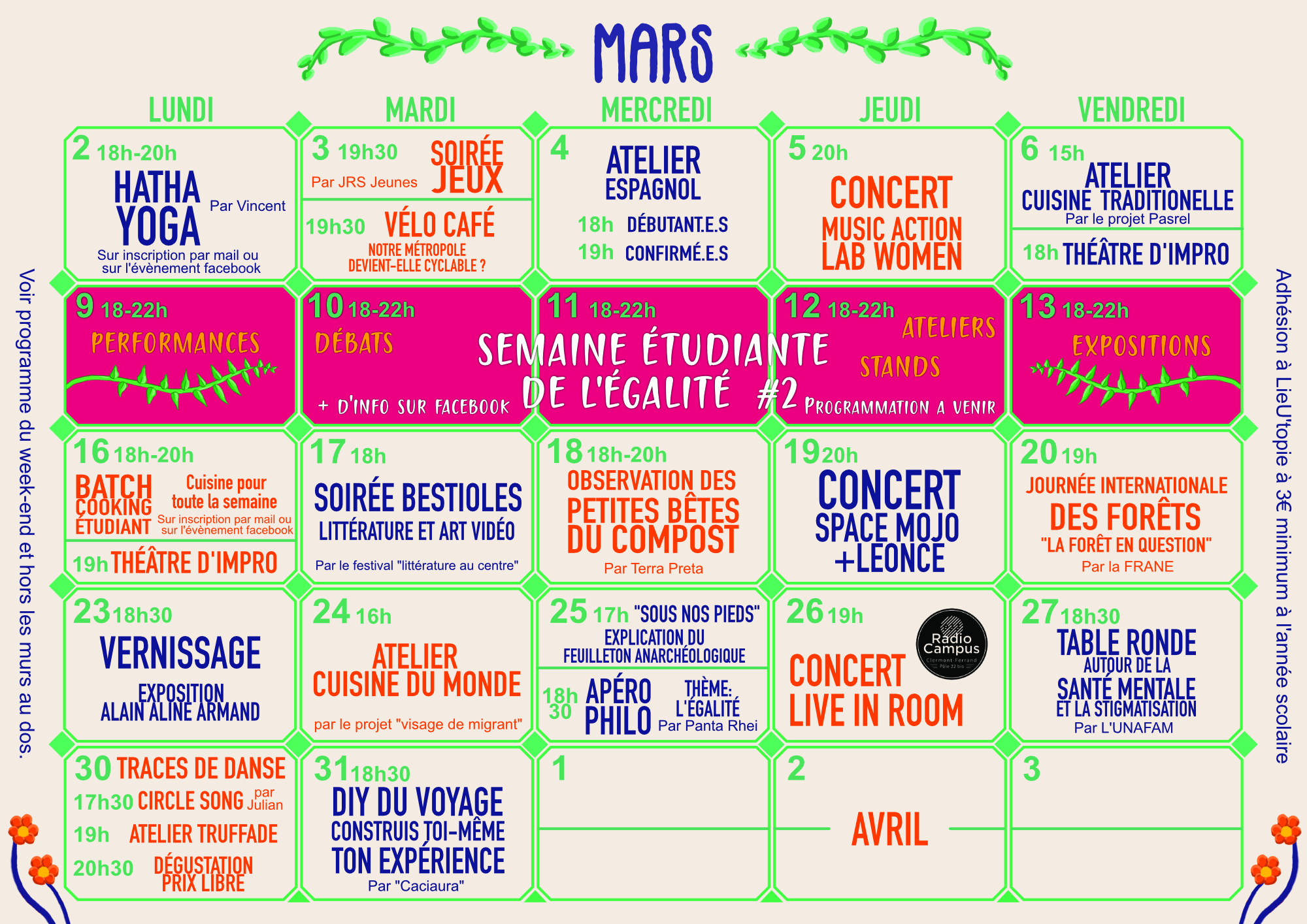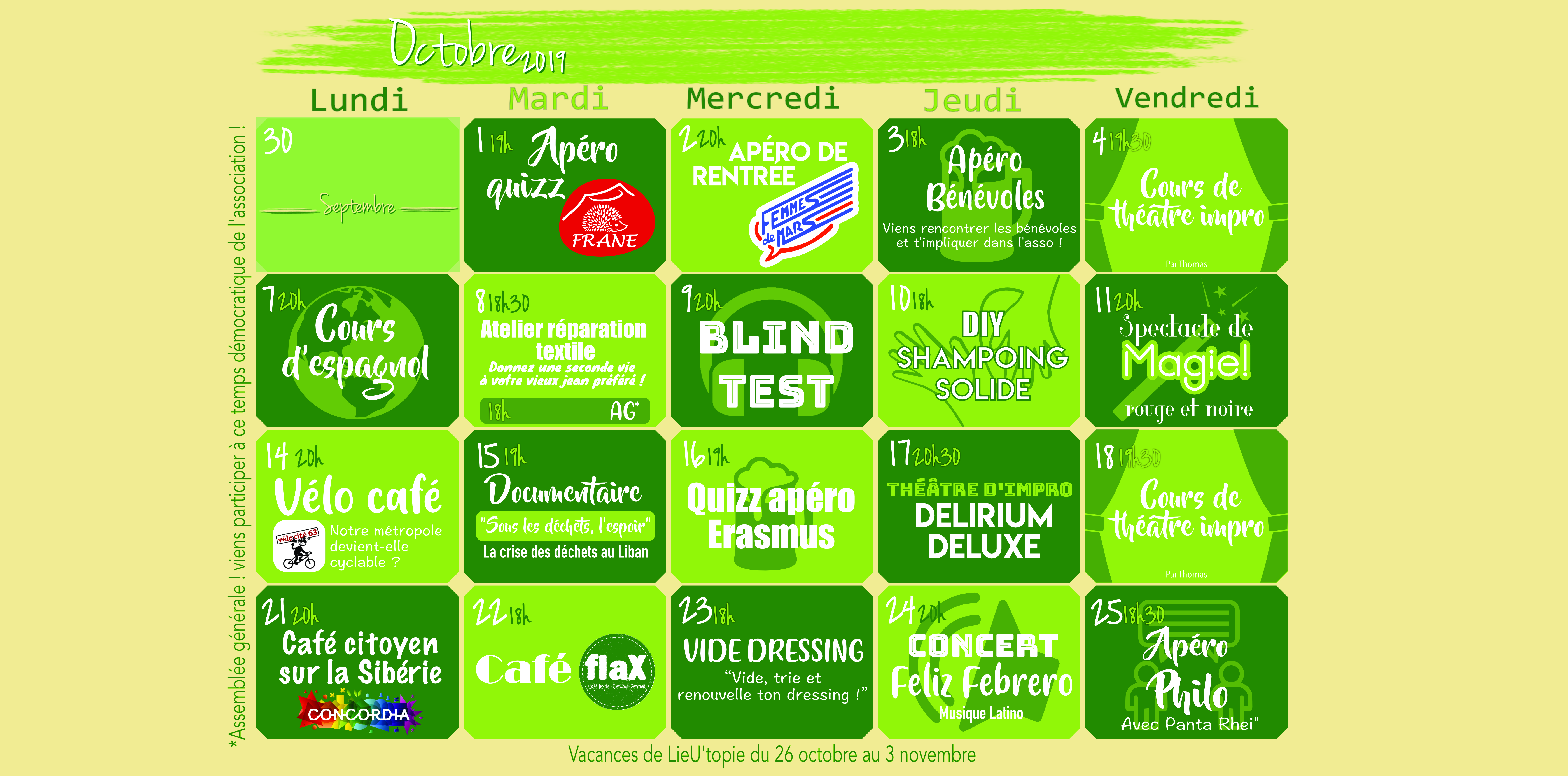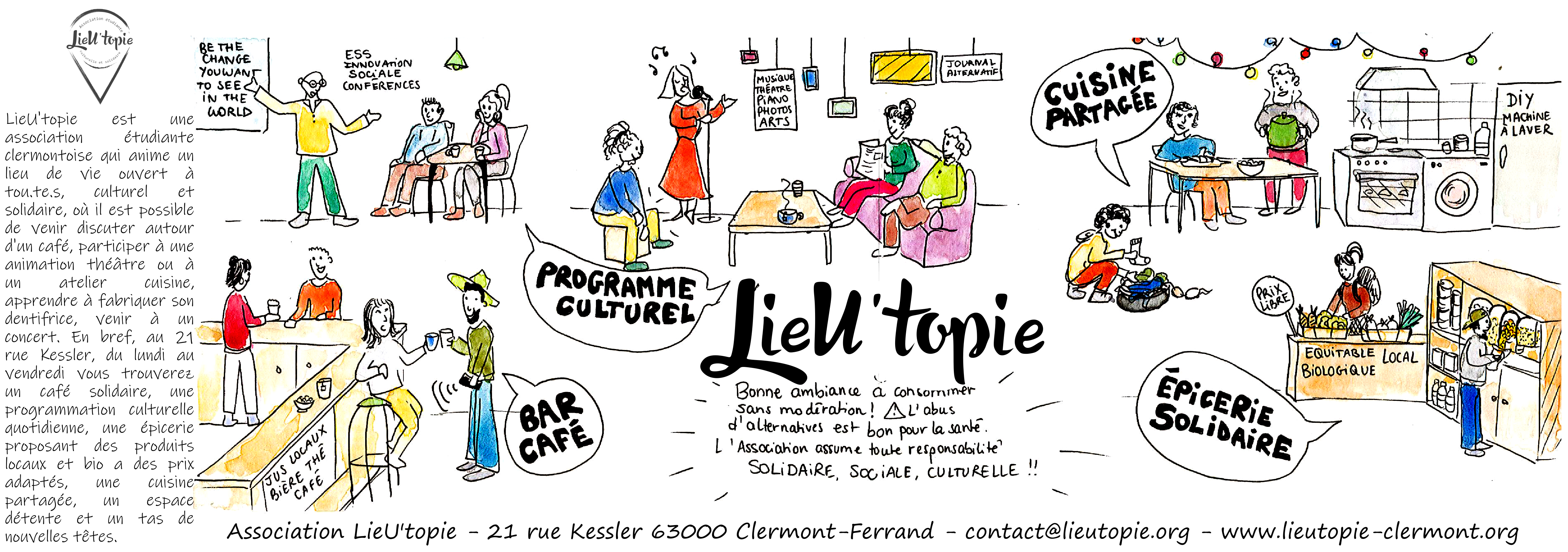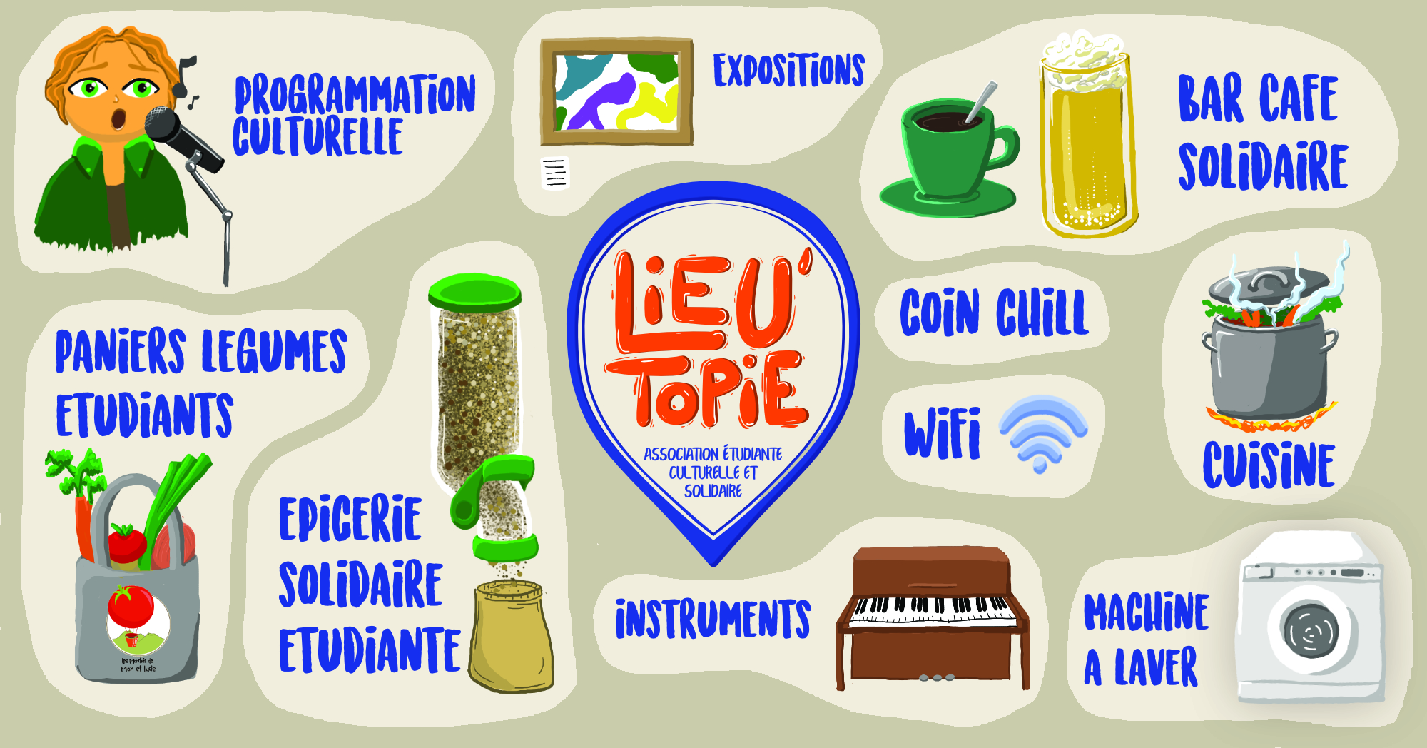 LieU’topie, c’est une association étudiante inclusive et solidaire à fort ancrage local. LieU’topie, c’est un tiers-lieu, ouvert à toust·e·s, étudiant ou non, revêtant la forme d’un espace accueillant, avec un café-bar, une cantine et une friperie solidaire, une ‘égalithèque’, des jeux, du matériel de bricolage, un coin chill…