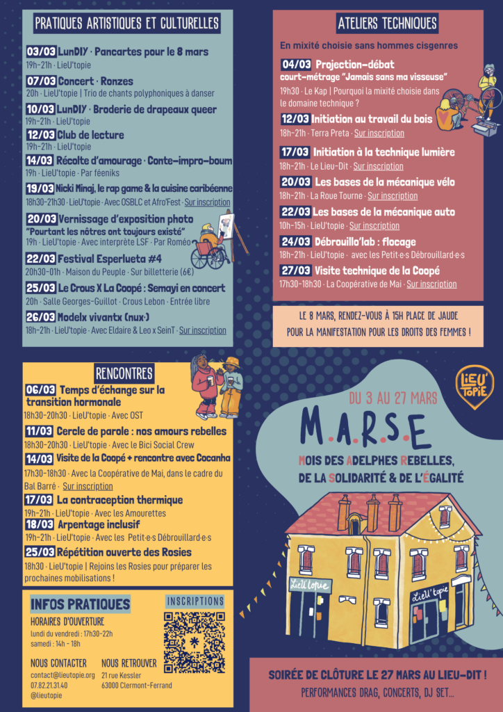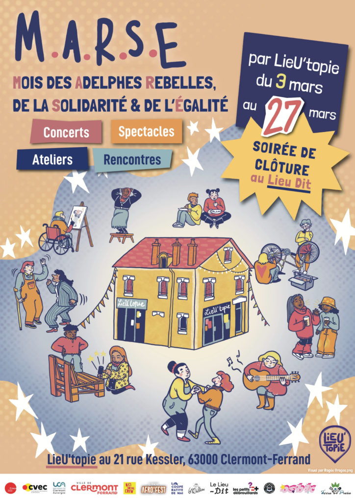 Le Mois des Adelphes Rebelles, de la Solidarité et de l’Égalité (ex-‘Femmes de Mars’ puis ‘Nos voix viennent de Mars’) est un festival qui a vocation d’éducation, de sensibilisation, de partage, d’inclusion, de lutte contre toutes formes de discriminations, de respect, de mixité, d’égalité, de solidarité. Il souhaite libérer la parole et prône le mieux vivre ensemble, en s’inscrivant comme il le peut dans l’intersectionnalité et souhaite ainsi cultiver cette place pour que chacun·e trouve la sienne. Si ces thématiques sont parcourus 2 à 3 événements par mois dans la programmation de LieU’topie, le mois festival de M.A.R.S.E est un grand moment de l’année qui a pour objectif de mettre l’accent sur la lutte contre les discriminations de genre, les LGBTphobies, les violences et harcèlements sexuels et sexistes (VHSS) et les violences faites aux personnes minorisées.